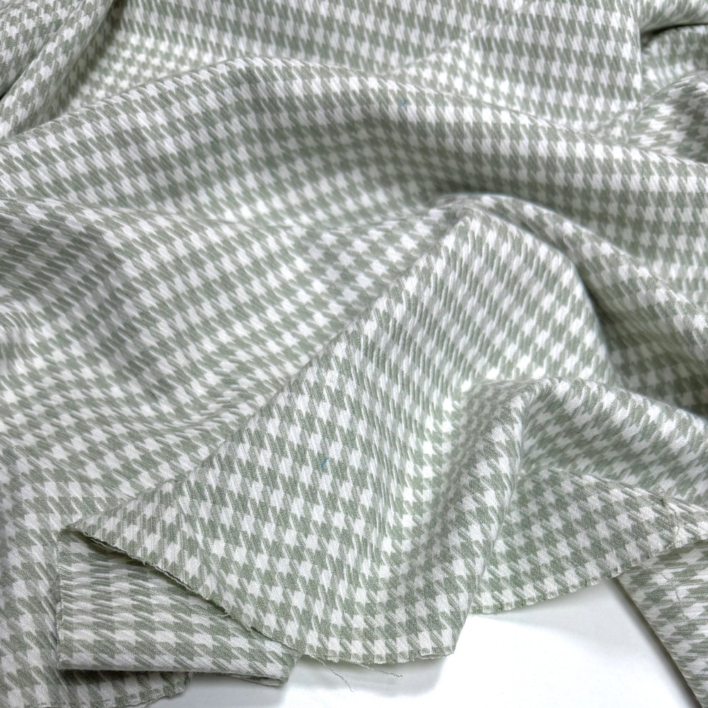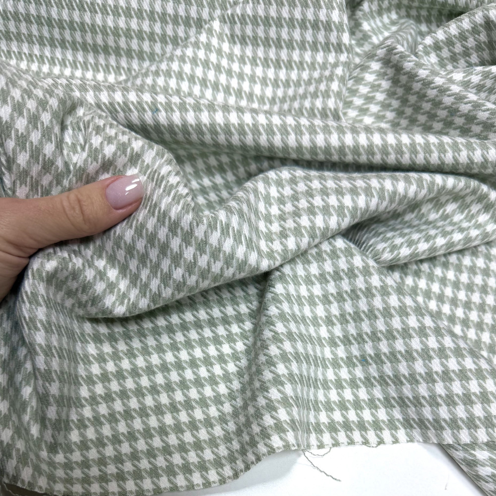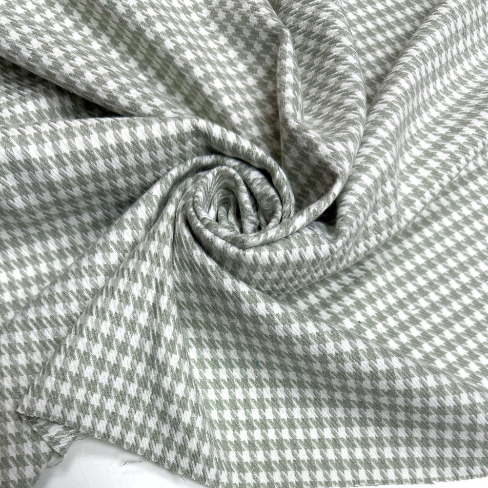 На вигляд тканина просто чарівна. Ніжне поєднання кольорів у візерунку дрібна гусяча лапка, що створений завдяки саржевому плетінню ниточок. Виглядає тканина дуже достойно, стильно.