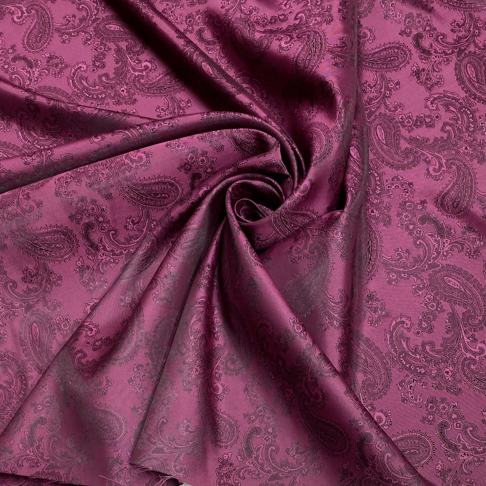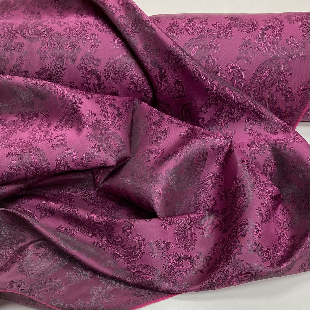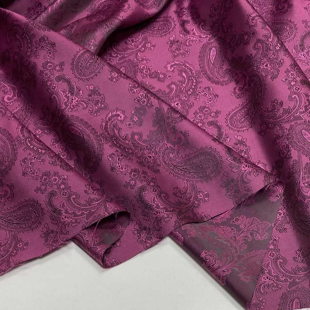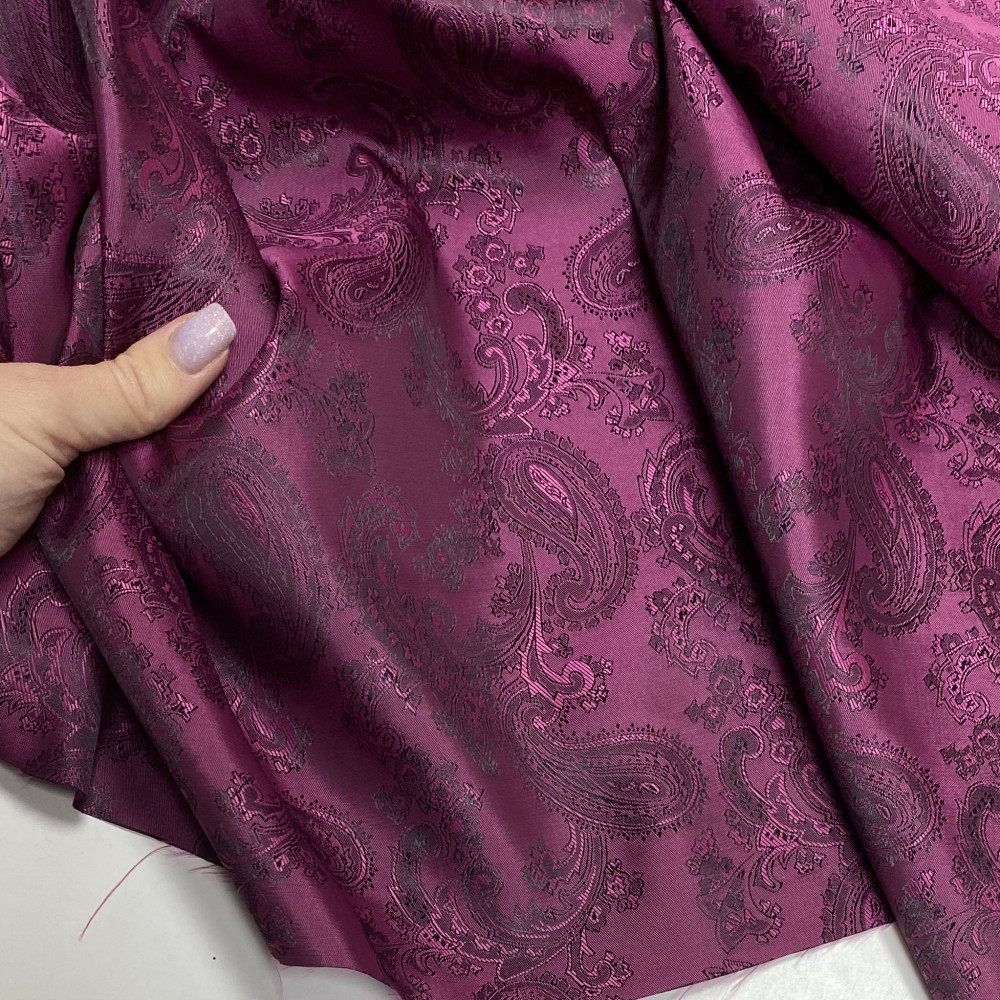 Глибокий темно-малиновий виразний відтінок. Щільний підкладковий матеріал. Без еластану. Має жакардову поверхню. Підійде як на жакети, спідниці, так і для верхнього одягу.