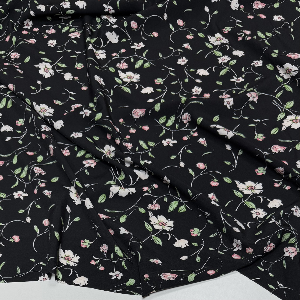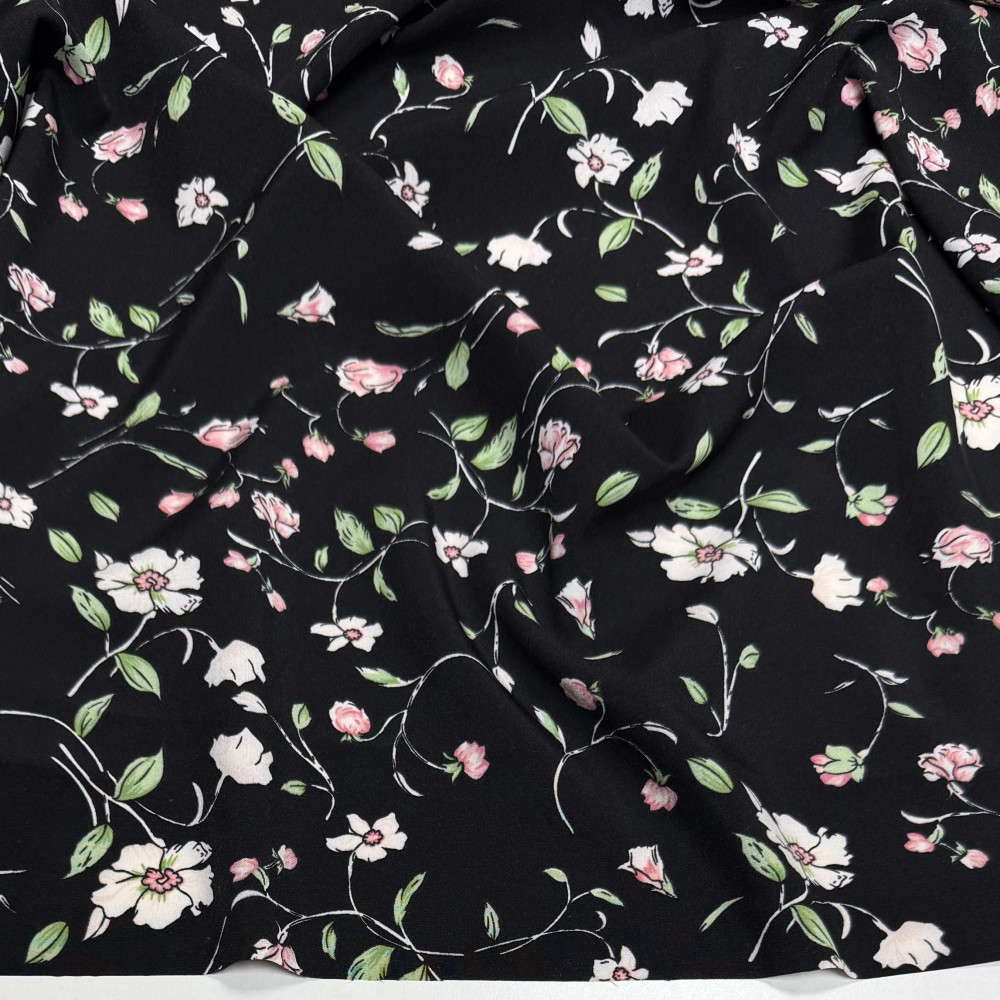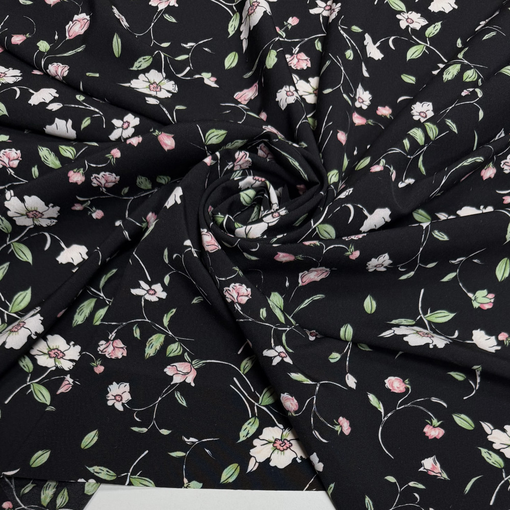 Ніжні, красивезні квіточки розподілені рівномірно по чорному фону тканинки.