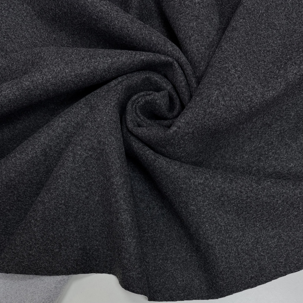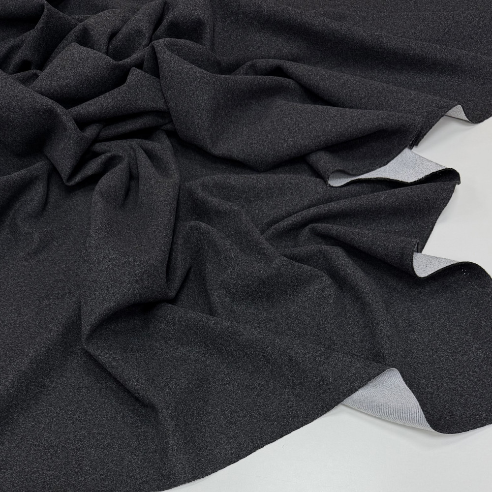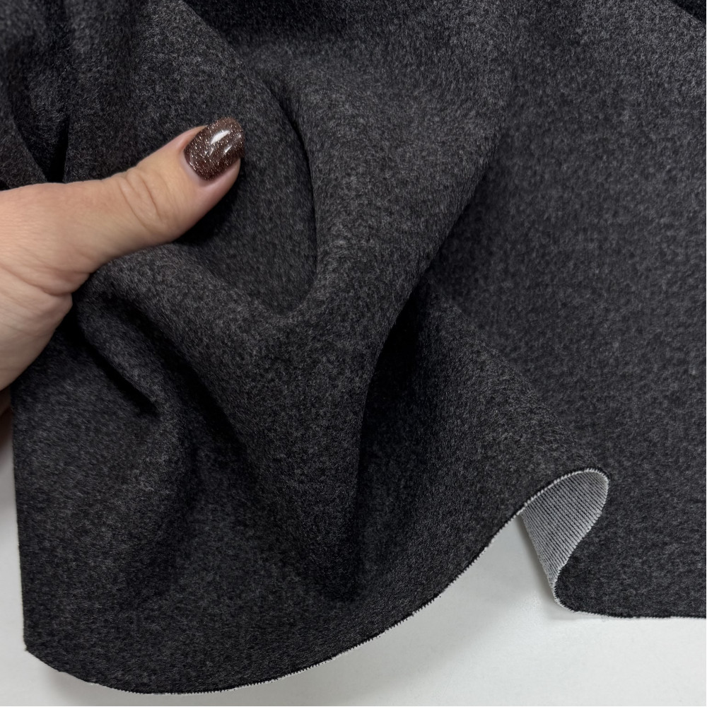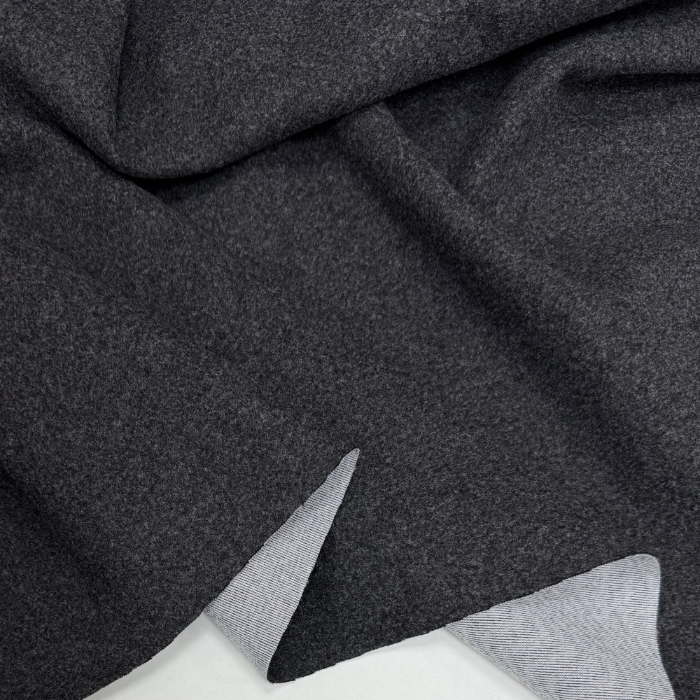 Темний сірий трикотаж з меланжевим ефектом. Поверхня з лиця гладка. З вивороту трикотаж білого кольору в якості основи.
