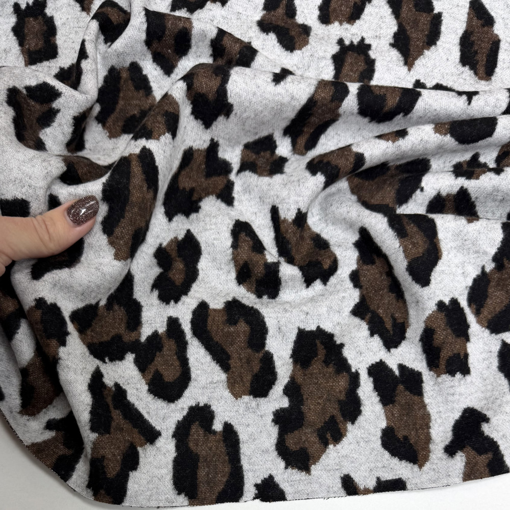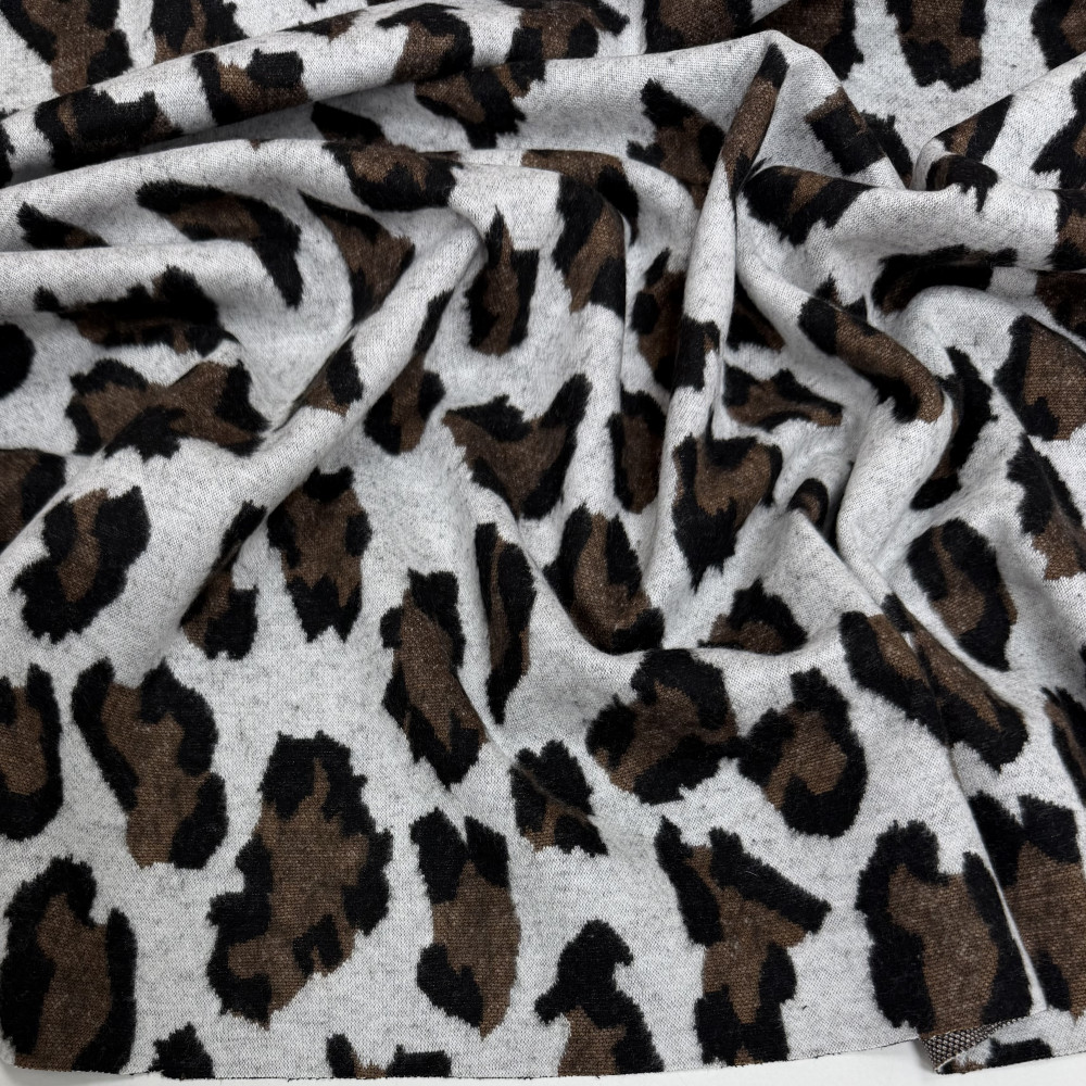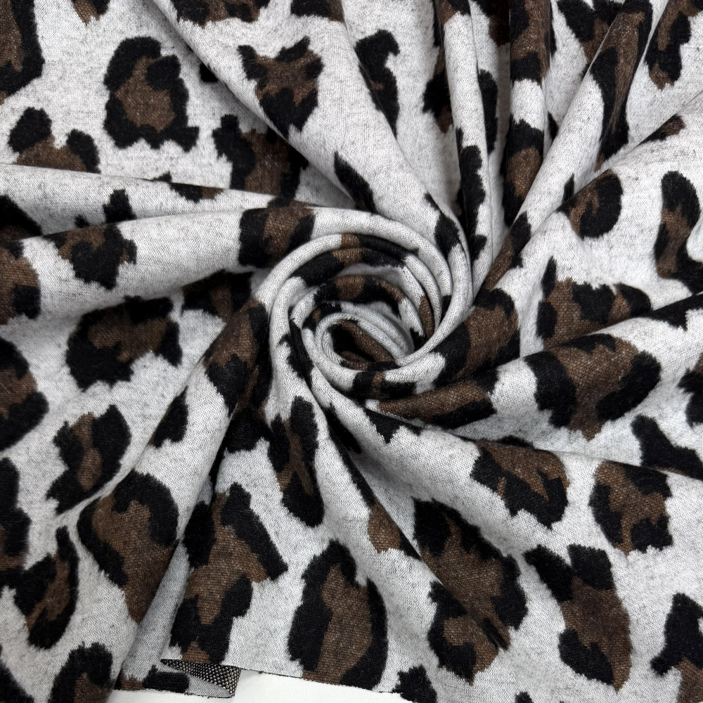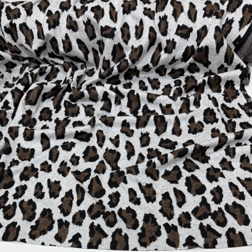 На світло-сірому меланжевому фоні анімалістичний візерунок у вигляді леопардових плям середнього розміру. Красиві, стримані кольори.