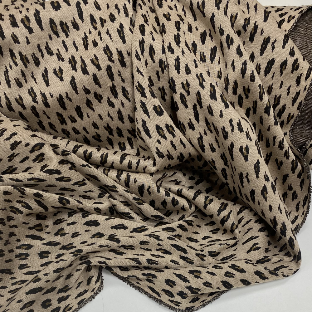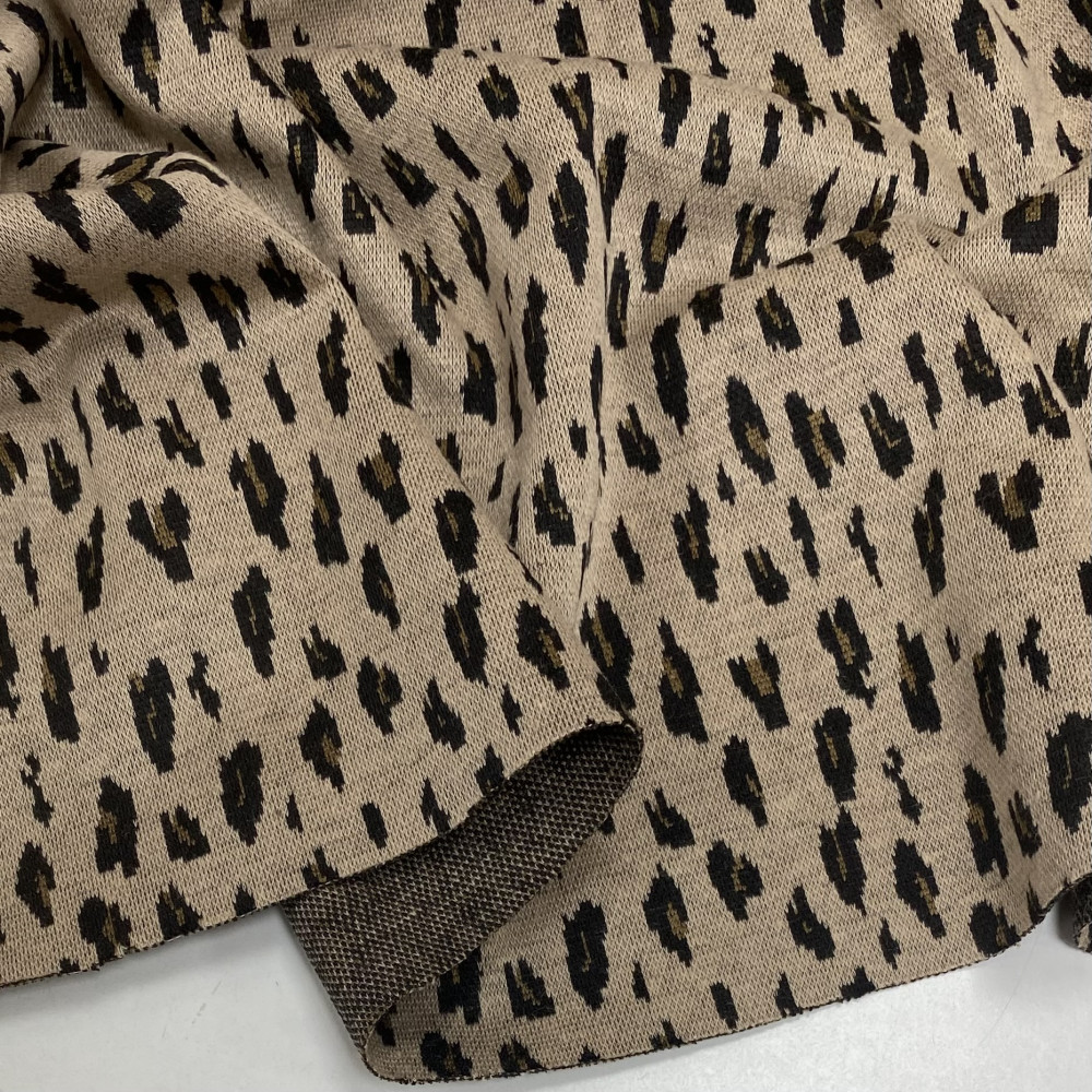 Дрібний анімалістичний візерунок із чорного та шоколадного кольорів. Леопардові плямки на пісочному фоні. Малюнок в‘язаний, не фарба.