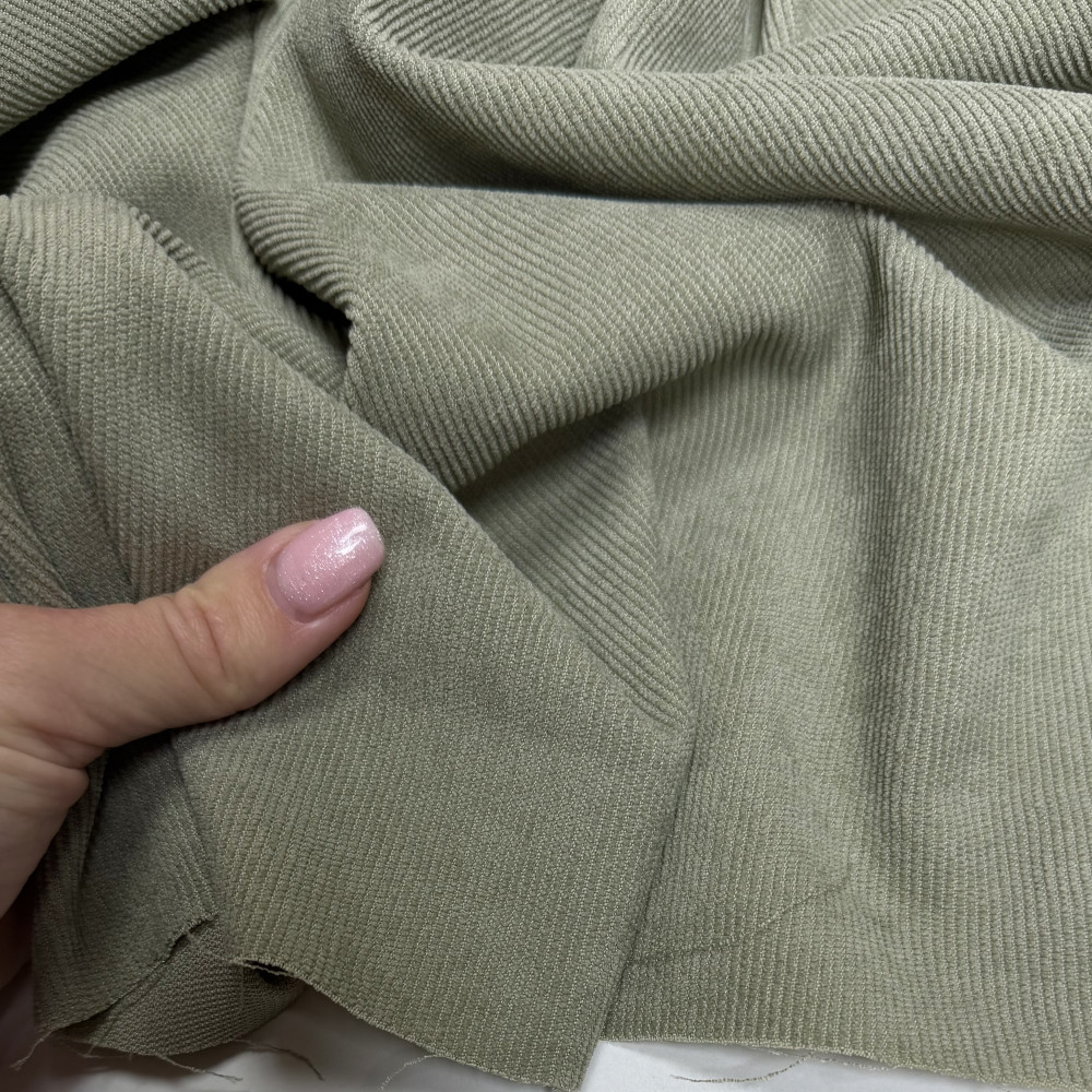 Красива, світла, тепла зелень. Тканинка костюмної щільності, ідеальнор підійде для пошиву будь-яких демісезонних речей: суконь, брюк, сорочок, спідниць, тощо. Має поздовжній рубчик з лицьової сторони, з вивороту гладка.