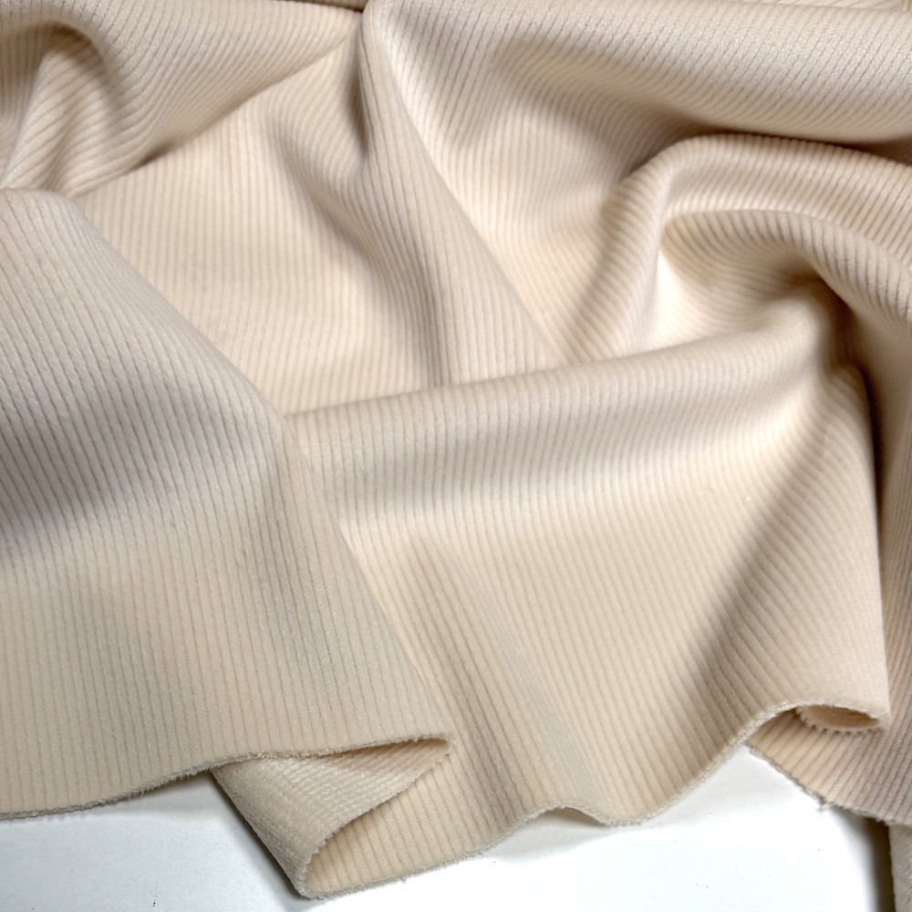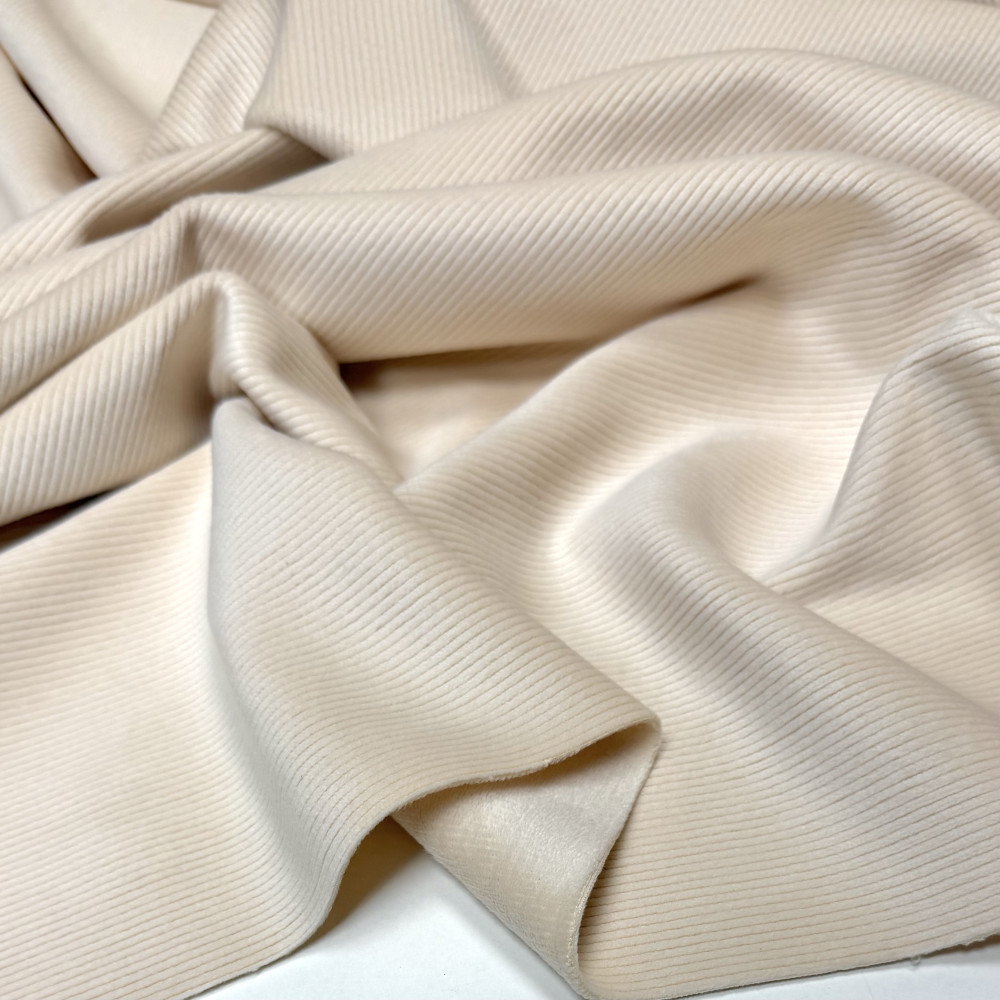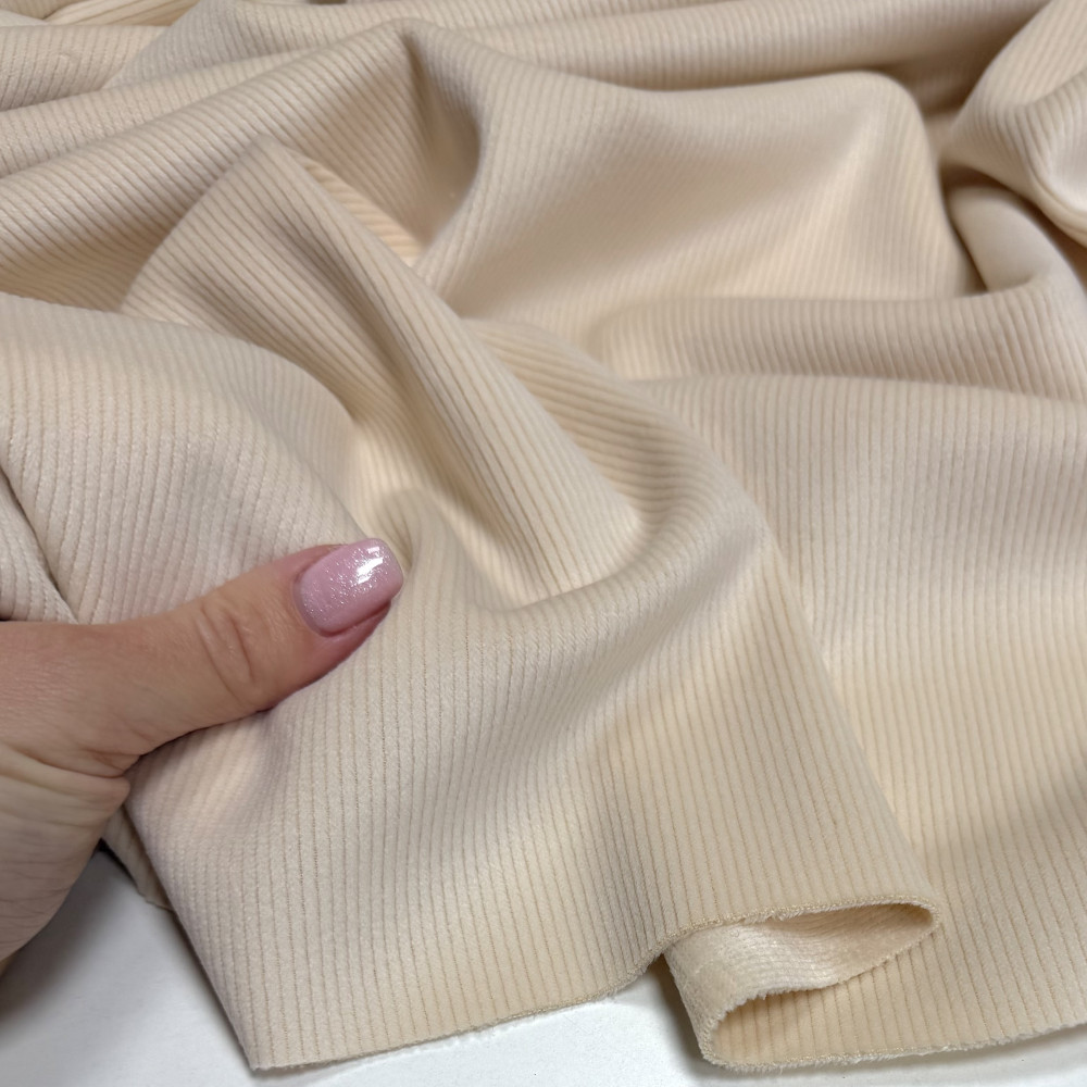 Тепла двостороння тканина з хорошим стрейчем. З лиця - поздовжній ворсований рубчик. З вивороту щільний рівномірний короткий ворс. Мʼякенький, дуже приємний на дотик трикотаж.